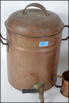 An early 20th century copper water urn fitted with brass tap to front and handles to the side together with a Princess Mary Chocolate tin and a selection of copper and brass measuring cups.