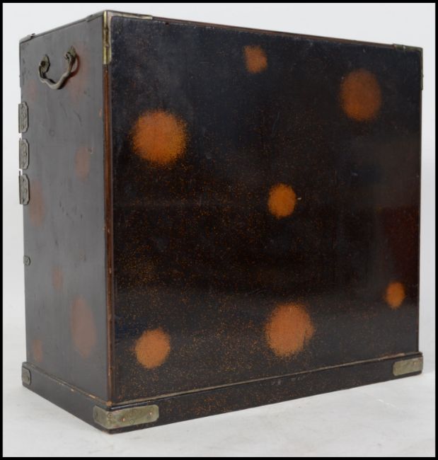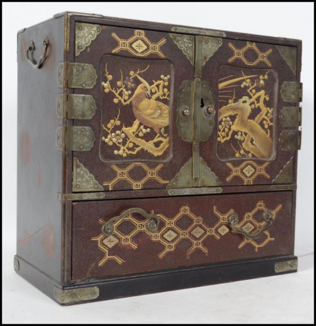 An early 20th century Japanese / Chinese chinoserie desk top box having twin hinged doors over single drawer to the base being red laquered.