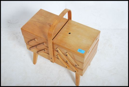 A 1950's retro beech - blond wood metamorphic sewing box raised on shaped supports having handle to centre and sectional metamorphic body