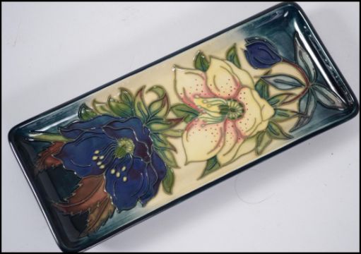A contemporary Moorcroft pen tray in the Hellebore design featuring a white and blue flower with foliates. Marked to base JC 099 with the Moorcroft stamp. Measures 20cms wide.