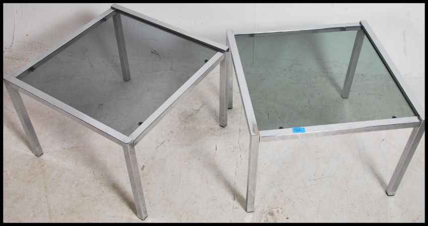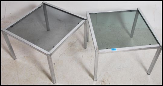 A matching pair of vintage chrome 1970's / early 1980's chrome framed and smoked glass occasional tables. Each of square form with tubular chrome construction. Measures:  41cms high x 56cms wide x 56cms deep.