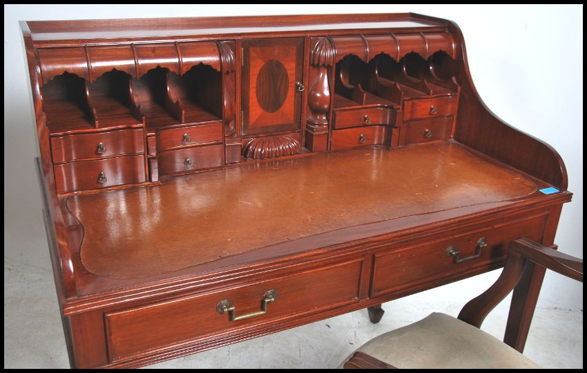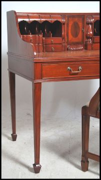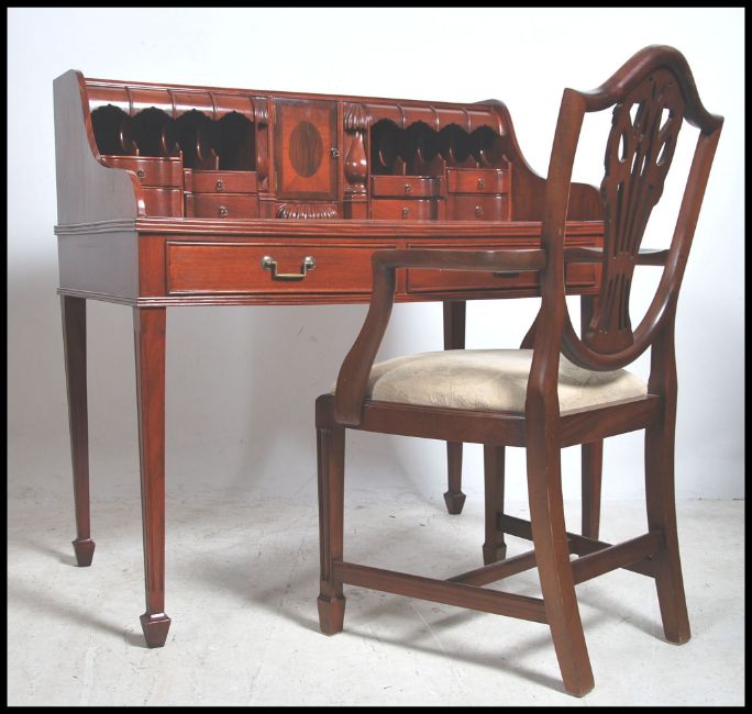 A very good antique Victorian style mahogany Carlton house ladies writing table desk having a waterfall appointed back with sectional drawers being set over tapered legs with fitted frieze drawers. Together with a good quality Georgian hepplewhite style carver desk chair