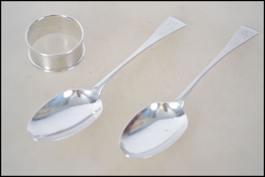 A pair of hallmarked Victorian silver desert spoons, hallmarked for Birmingham 1893 by William Devenport together with a hallmarked silver napkin ring hallmarked for Birmingham 1989 by Broadway and Co.