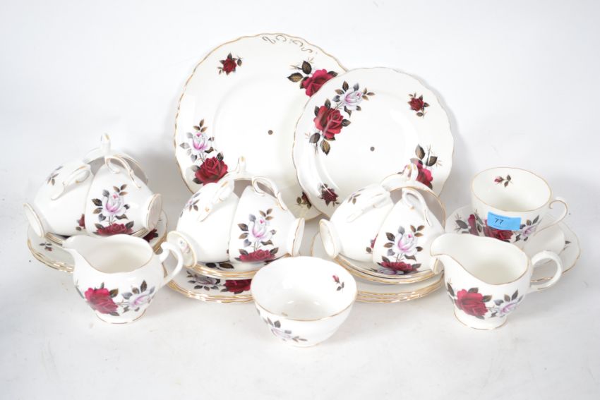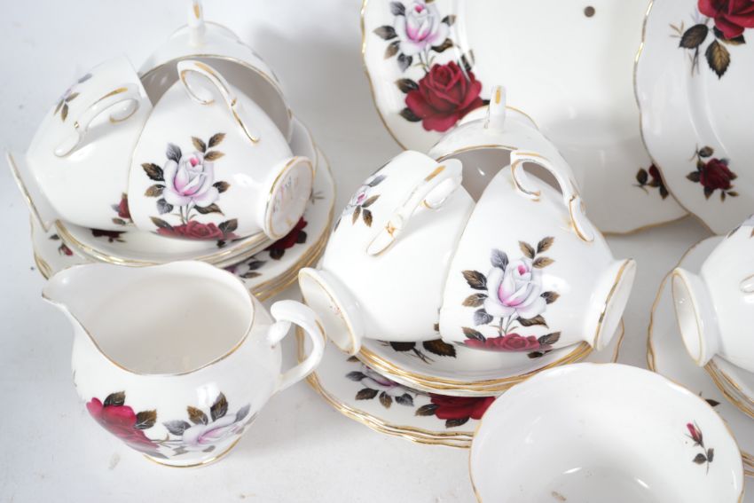 A vintage 20th century bone China Colclough 34 piece ' Rose pattern ' tea service consisting of trios, sugar bowl, creamers, side plates, and sandwich plates.