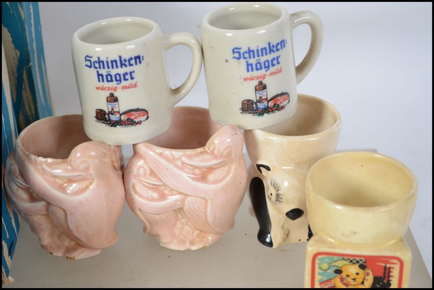 An unusual mid century Czech glass sculpture of a boy and girl holding hands being set within the original box. Together with Sooty 1970's egg cups, 2 other penguin egg cups etc. Tallest measures 6cms high.