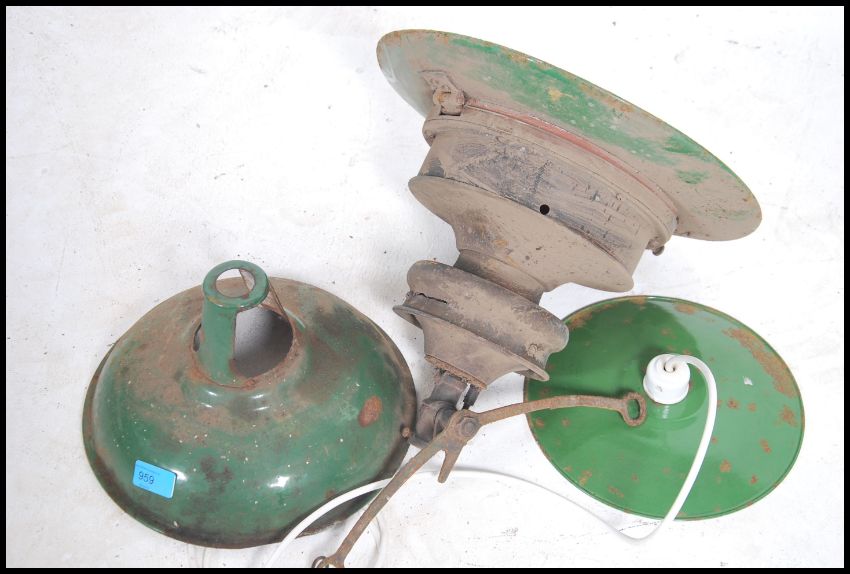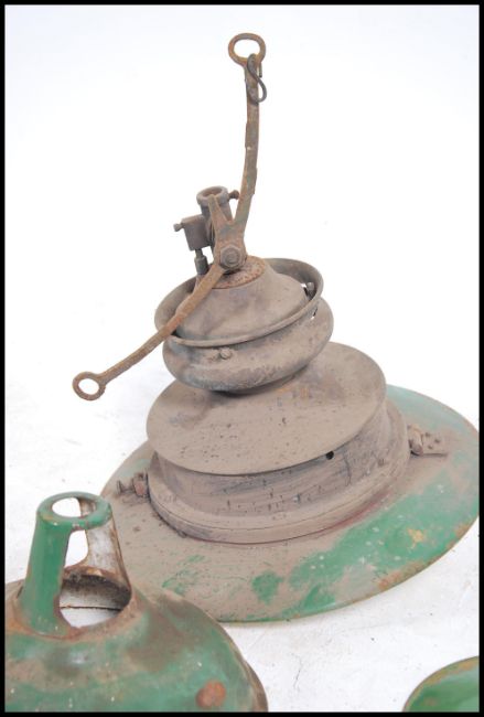 A group of three vintage 20th century industrial factory lights, each with matching green enamel shades please refer to images. Measures:  50cms high x 35cms wide x 35cms deep.