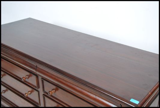 A good Victorian style mahogany double chest of drawers having a flared edge top over double bank of drawers with knob handles. All raised on plinth base. Measures:  85cms high x 155cms wide x 60cms deep.