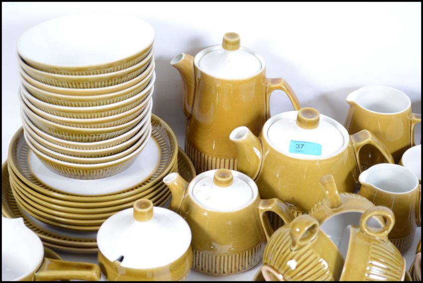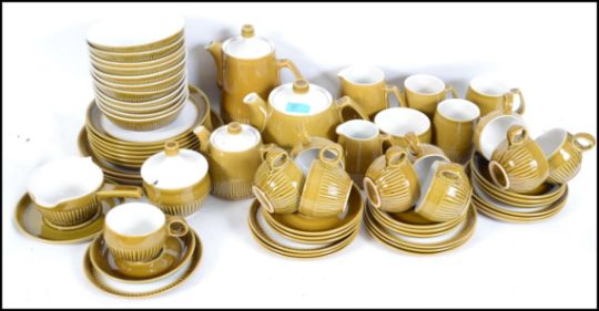 A retro stone ware style service by Langley consisting of trio's, coffee pot, teapot, dinner plates etc. Please see images.