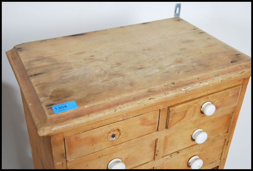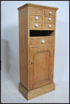 A Victorian / early 20th century unusual pine tall cabinet raised on a plinth base with a series of short drawers over cupboard beneath. Measures:  104cms high x 198cms wide x 74cms deep.