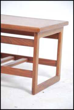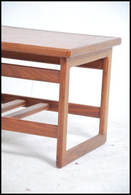 A retro 1970's teak tile top coffee table of rectangular form with squared supports and slatted rack to underside. Measures:  40cms high x 84cms wide x 45cms deep.