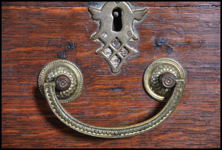 A Georgian 18th century country oak Queen Anne Chest of drawers on stand. Raised on cabriole legs having a serpentine apron with fitted 3 drawers. Above a chest with central bank of short and deep drawers. FInished with oak lined drawers, stunning brass cast drop handles with roundel back plates. Flared edge top above. Dismantles into 2 pieces for ease of movement. Measures:  168cms high x 101cms wide x 50cms deep.