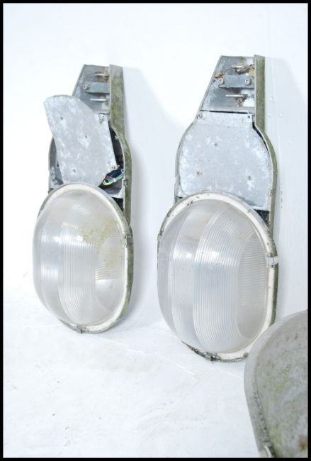 A group of four vintage mid century industrial Phosco lighting street lamps in grey. Measures 56cm high x 27cm wide x 20cm deep.