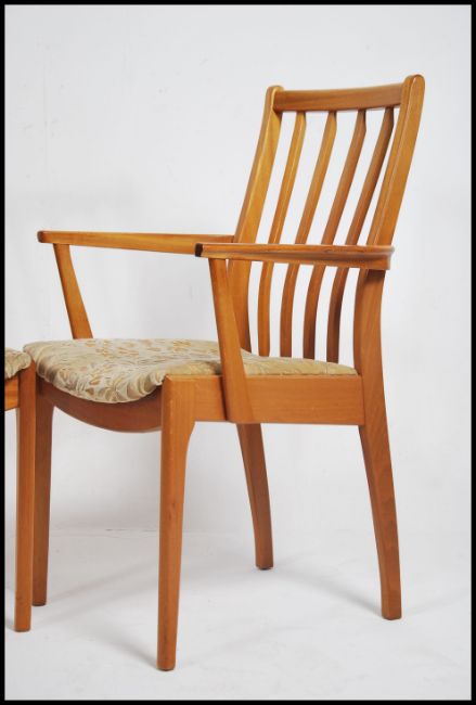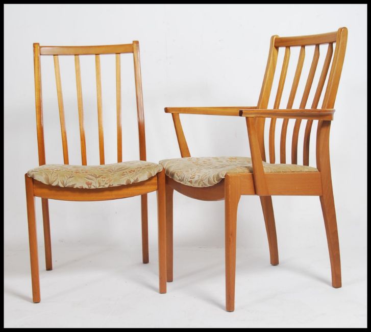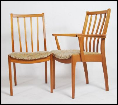 A set of 6 1970's G-Plan teak wood dining chairs being raised on squared legs with pad seats and railed back rests. Measures: 91cms high x 42cms wide x 52cms deep.