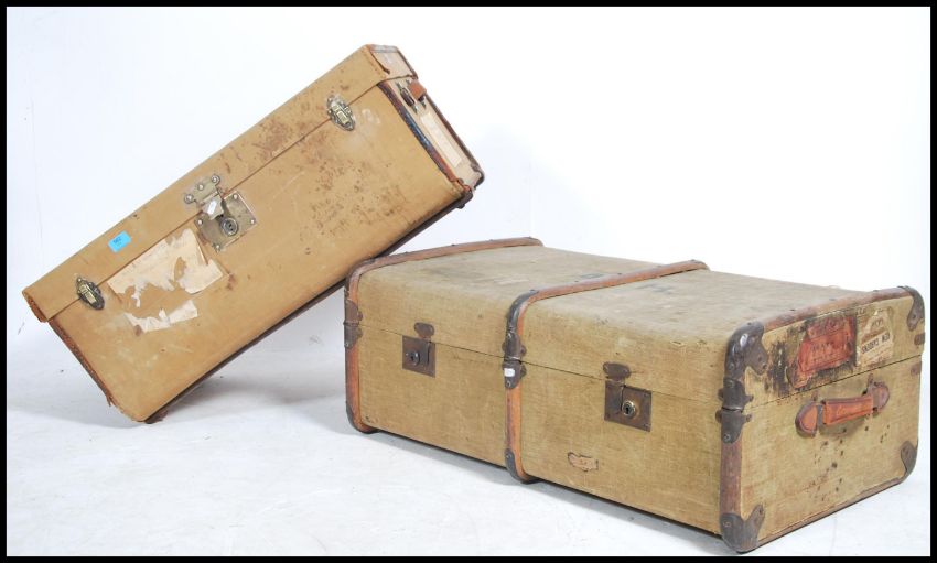 A Pair of non matching early 20th century steamer trunks to include a canvas and wooden bound example.