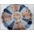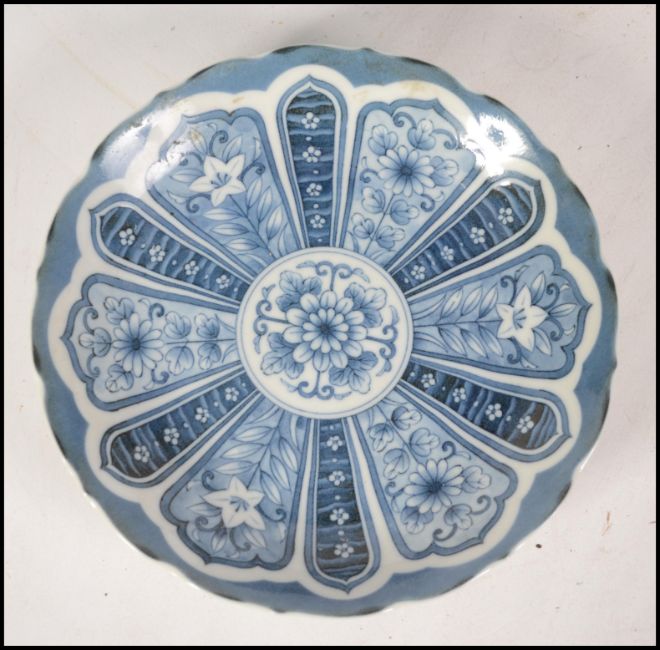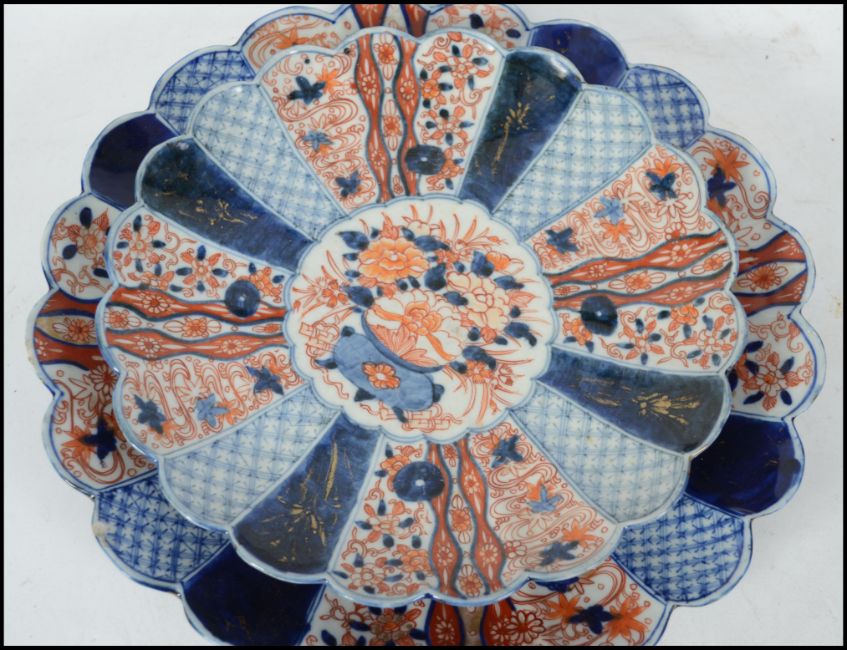 2 Chinese Imari pattern dishes in polychrome colours of red, blue and white having geometric patterns together with another Chinese blue and white dish. The Imari chargers with blue foliates and blue concentric circles to the foot.