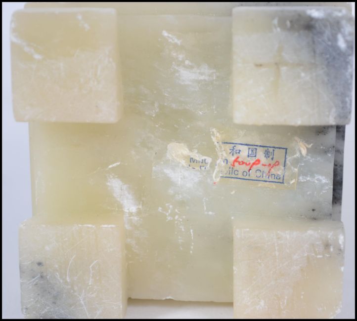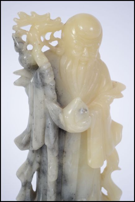 A well carved 20th century Chinese soap stone figure of a scholar with a Qilin shaped staff raised on a square plinth base. Measures 24cm high.