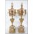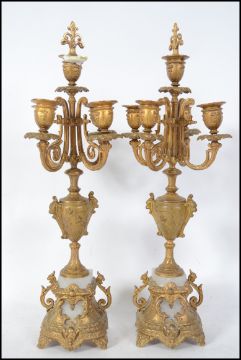 A pair of 19th century gilt metal and soapstone 5 sconce table candelabra. Each with gilded metal plinth bases with ormulu decoration, soapstone panel work culminating in 5 scone candles, the centre with finial caps. Measures 49cm high.
