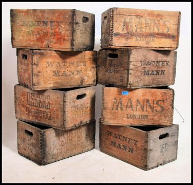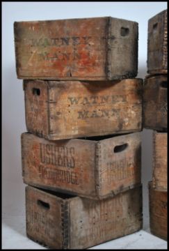 A stack of vintage mid century wooden advertising beer bottle crates, each with notation for Ushers of Trowbridge and Watney Mann. Some with remains of original colour paintwork ( see illustrations ). Measures: 30cms high x 36cms wide x 28cms deep.