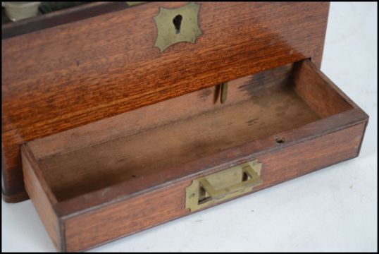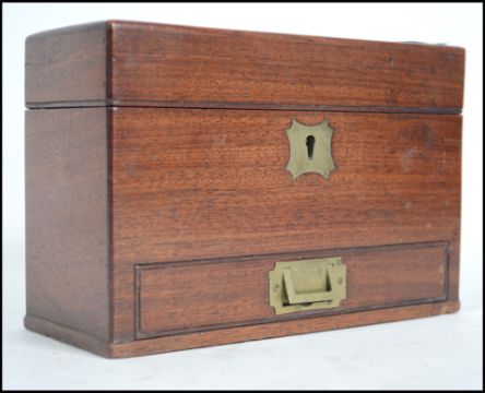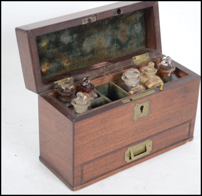 A stunning 19th century campaign mahogany chemists apothecary travelling cabinet.  The hinged top with baize lining  having appointed bottles some with notation. Beneath a single drawer with campaign sunken brass handle