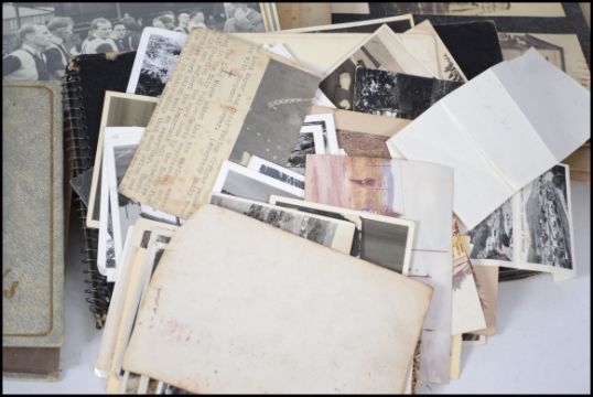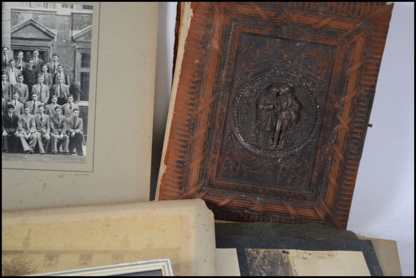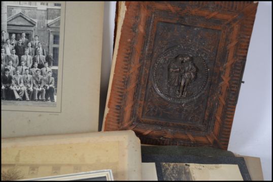 A good leather early 20th century photograph album with bronze plaque to centre having portrait photo studies. Together with many other loose photographs and also mounted school / college photographs etc
