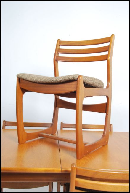 A 1970's retro Portwood furniture teak dining table and 4 chairs of Danish influence. The table raised on angled supports complete with the matching dining chairs with pad seats. Measures 72cms x 137cms x 96cm..