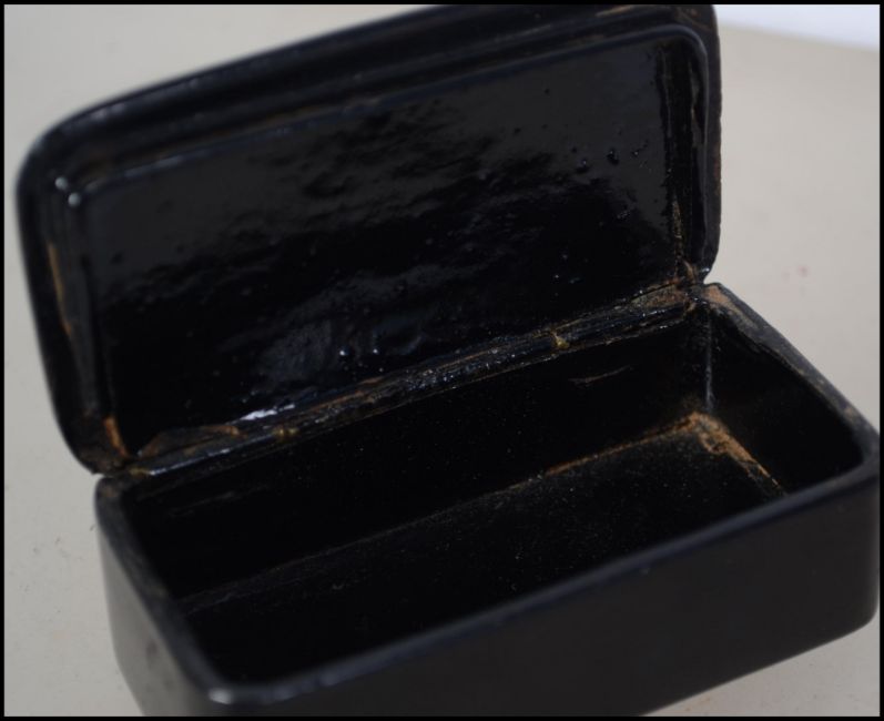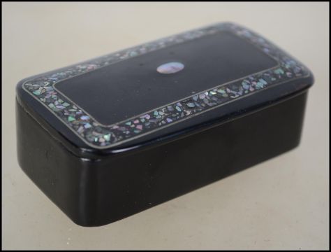 A 19th century gentlemans papier mache and abalone inlaid snuff box of rectangular form having hinged lid atop