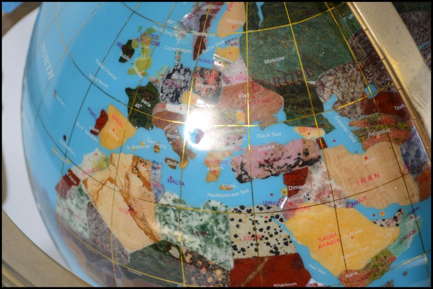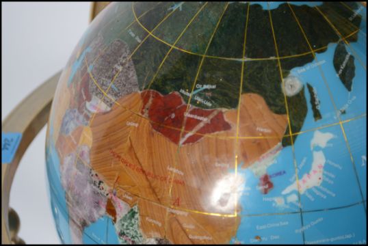 A 20th century hard stone and brass desk terrestrial globe, inlaid with various specimens