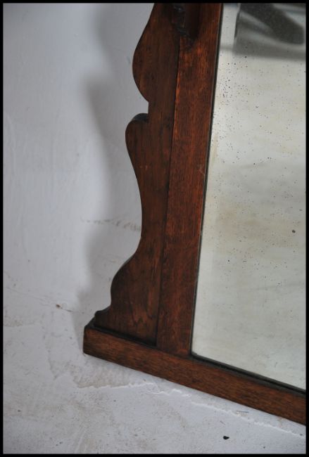 An early 20th century Edwardian oak overmantel mirror with shelved top and fielded panel top rail being set over bevelled edge mirror to the underside. Measures:  102cms high x 86cms wide.