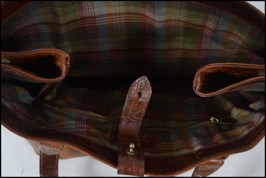 An original Mulberry brown faux crocodile leather tote bag. This handbag has a fully adjustable shoulder strap with zipped interior compartments.  The brass logo fob bears the unique piece number 682026.