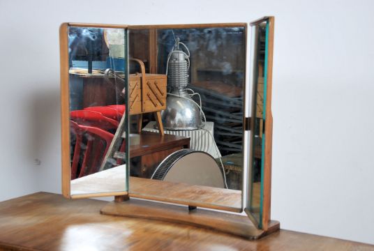 An original Gordon Russell walnut dressing table of five drawers with triple mirror. All raised on tapered legs being stamped Russell of Broadway, 122cm