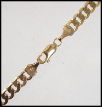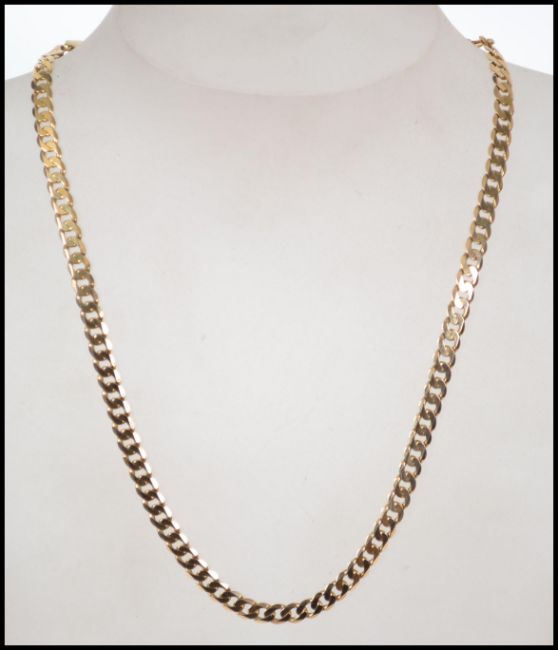 A 9ct gold flat curb link necklace chain having a lobster claw clasp. Chain measures 18 inches and weighs 15 grams. Marked 375 to clasp London makers mark IBB inside a club.