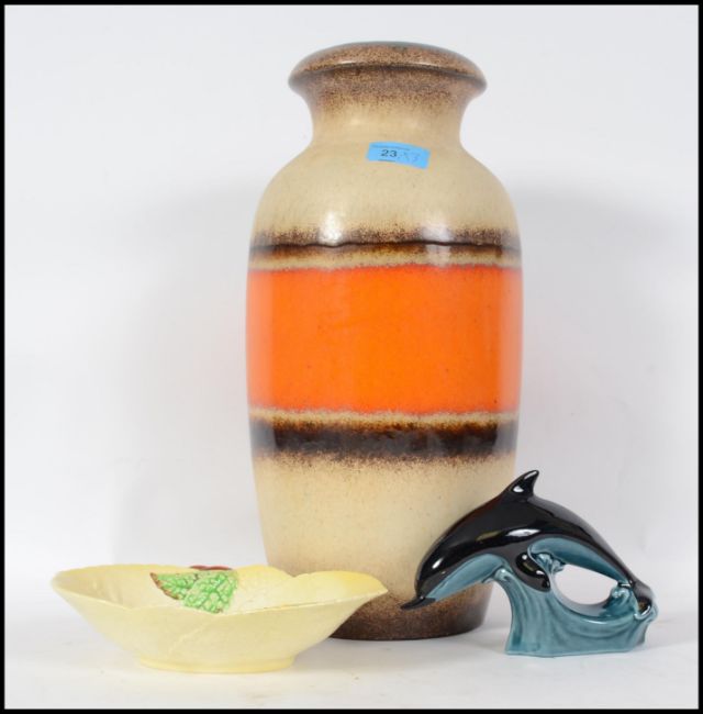 A collection of ceramics to include a large retro Fat Lava style vase by Scheurich - Keramic. Together with a Carlton Ware dish, Poole Pottery Dolphin etc. Tallest 39cms high.