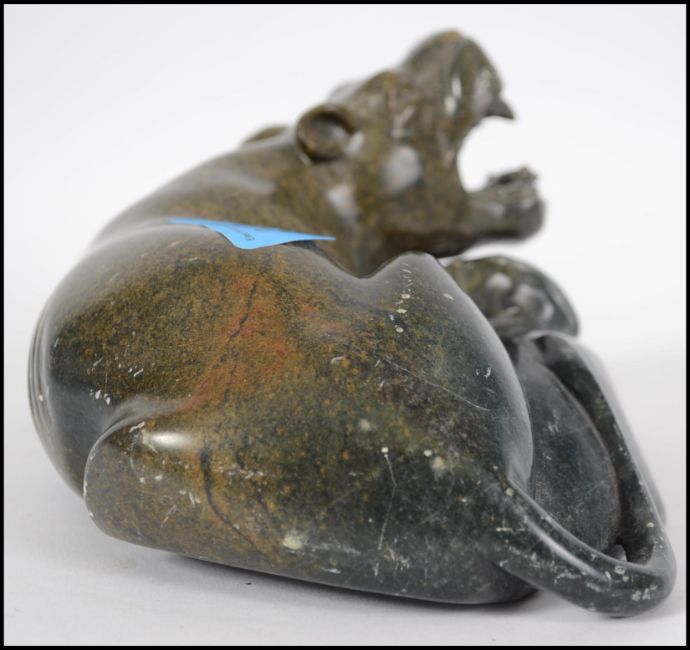An Oriental green soapstone carving of a hippopotamus protecting its kill, being signed to reverse. Measures 21cm wide.