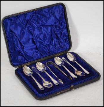 A silver hallmarked teaspoon and sugar nips set complete in the original presentation case by  Harrison Brothers & Howson, Sheffield 1892?