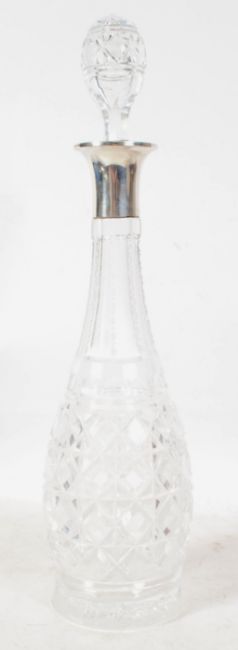 A silver collared cut glass decanter having a Sheffield assay mark rubbed makers mark