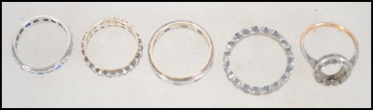 A group of four eternity rings along with one other all of which are silver and 9ct gold