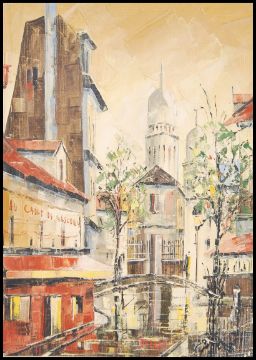 A 20th century framed  oil / guache on board of a Parisian street scene signed to corner. Measures:  47cms high x 34cms wide.