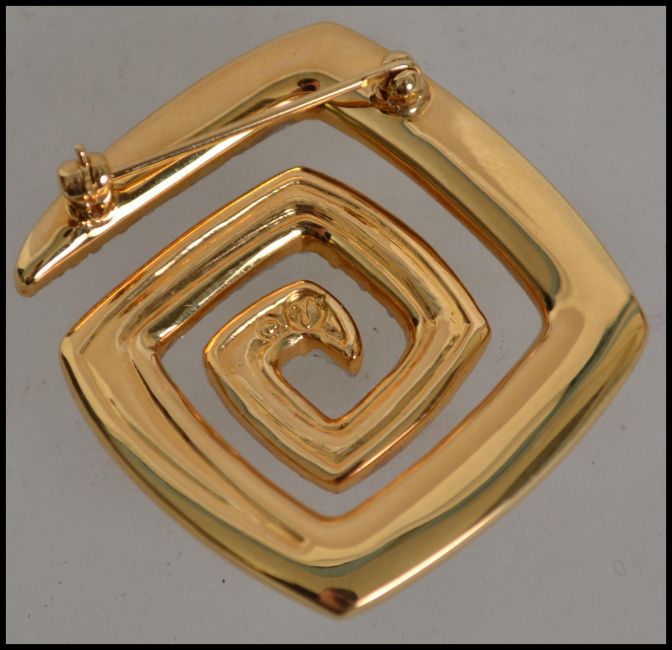 A contemporary Swarovski ladies crystal brooch in the ' greek key ' form having yellow metal back with pin. Complete in the box