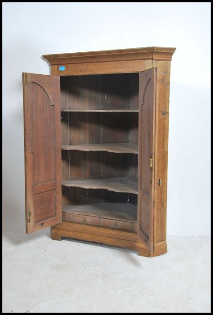 An early 19th century Georgian solid oak hanging corner cupboard. The twin fielded panel doors with brass handles housing a serpentine shelved fitted interior. Finished with flared edge cornice top.