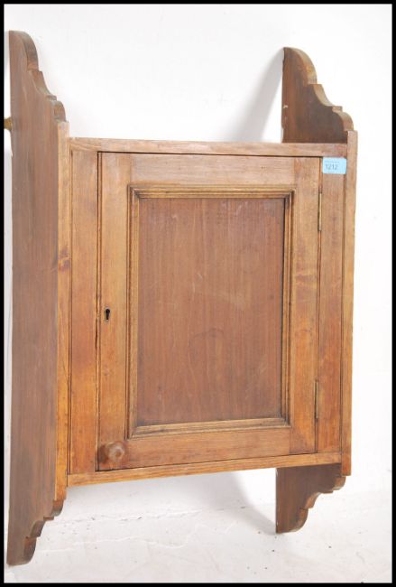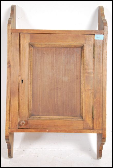 A 1920's hanging oak wall cabinet having shaped waterfall supports having central oak door with shelved interior. Measures:  75cms high x 44cms wide x 21cms deep.