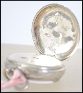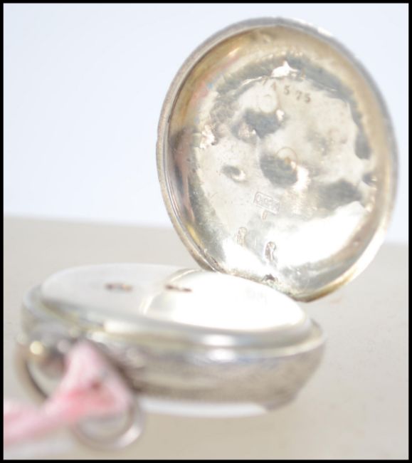 A continental silver and enamel open faced ladies pocket fob watch. The decorative face with key wind movement set all within rococo chased case
