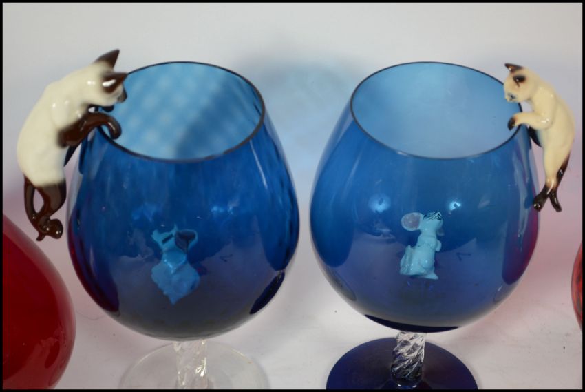 A set of 4 red and blue large brandy glasses of bulbous form complete with the adorning Beswick Cats and mice ( see illustrations )