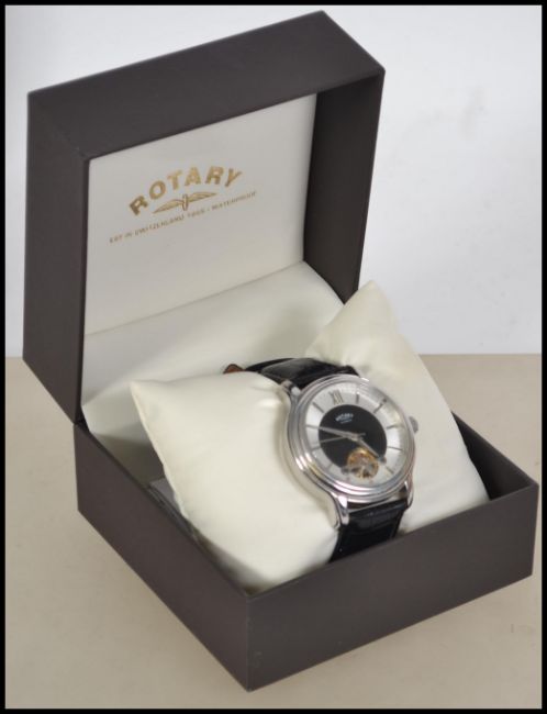 A good Rotary Automatic skeleton wristwatch having black dial with baton numerals and faceted hands. Set to a black leather strap complete with case and packaging in full working order.