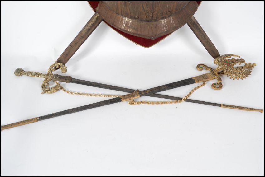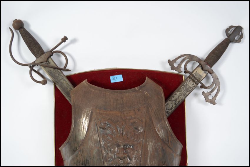 A large faux medieval knights metal breastplate together with 2 swords being set to an armorial plinth back. Complete with 2 further decorative hanging swords with scabbards and decorative handles. Measures 80cm high.