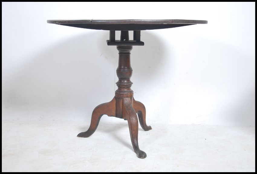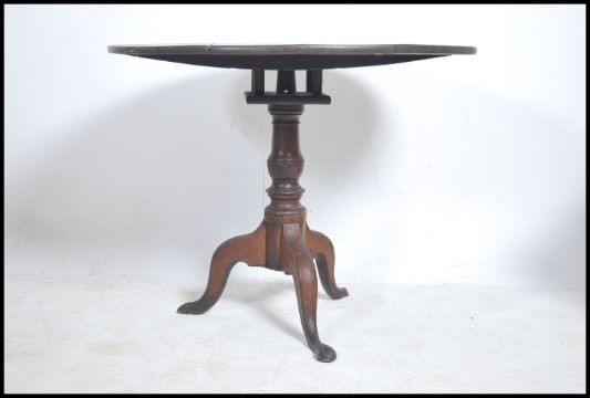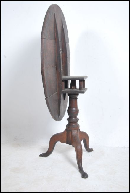 A Georgian 18th century oak birdcage tilt top table raised on splayed legs with turned column having circular table top above
