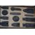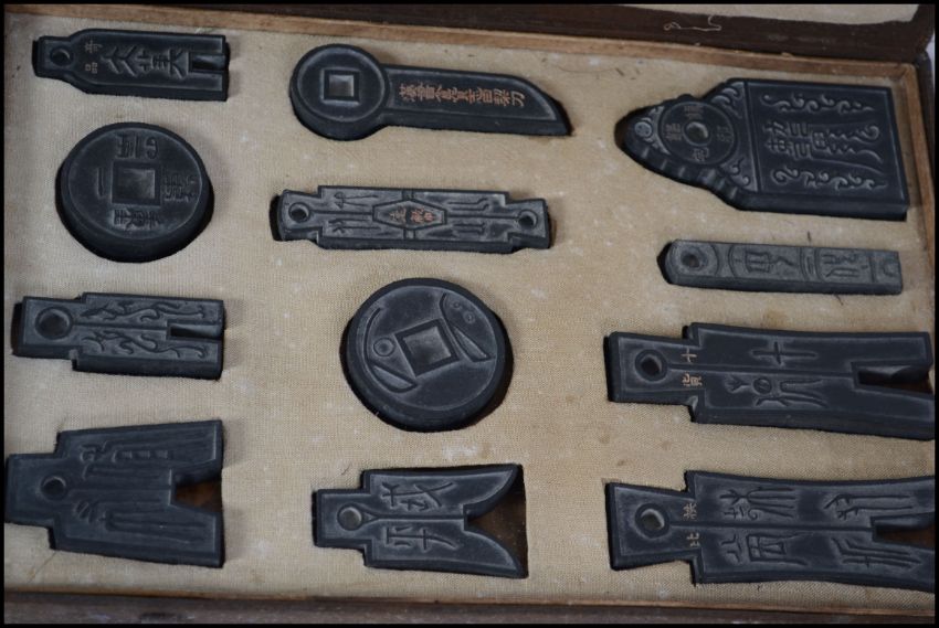A good Chinese set of 12 ink cakes  complete in the  scholar's box dating to the late 19th /  20th century each in black being  finely decorated with intricately carved details some with gilded notation. Measures: 27cms wide.