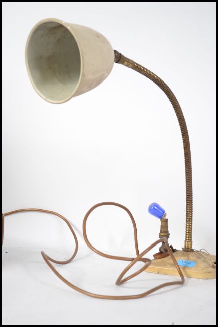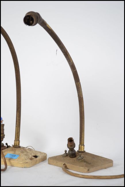 A pair of vintage mid century retro gooseneck anglepoise desk lamps with flicker switches to the base and lights. One with bell shade, one without