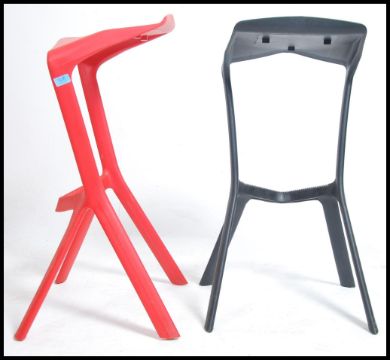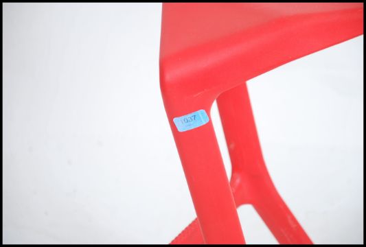 A set of 6 modernist 20th century stacking bar stools in red and black colours, each being of angular design ( see illutrations )