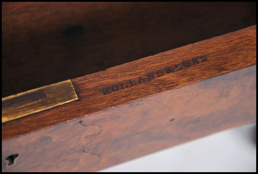 A Victorian mahogany Holland & Sons of London writint table desk. Raised on turned, tapering legs with ceramic castors. Fitted frieze with drawers , one being stamped for Holland & Sons ( see illustrations ) Finished with flared inlaid border top above. Measures:  74cms high x 92cms x 51cms deep.