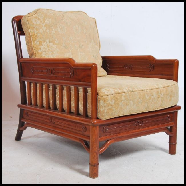A pair of 20th century Chinese influenced hardwood upholstered armchairs. Each having gallery railed open frames with over stuffed cushions. Retailed by Brights of Nettlebed. Matching sofa in lot number 1224